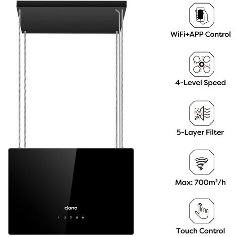 Also a decoration: The appearance of the cooker hood is simple but elegant. The wire can be adjusted to fit different situations. With it hanging in the kitchen, you will have a very useful decoration.