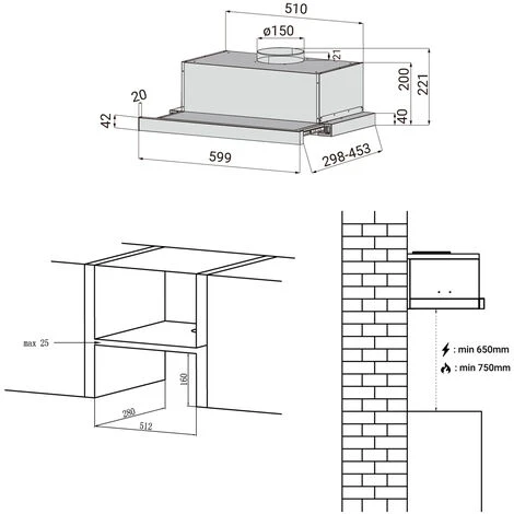 Integrated Telescopic Cooker Hood: Rocker Control, Extraction rate of 370m³/h, noise sound pressure of 64dB(A), 2 venting speeds. Class A Energy Efficiency, energy saving, and environmental friendly.