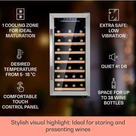 Klarstein Free-standing Wine Cooler Drinks Fridge, Indoor/Outdoor Wine Fridge Drinks Cooler, Small Beer Fridge with Glass Door, UV Protection, Touch Controls, Activated Charcoal/Carbon FiltersTaking wine out of the restaurant and into the home, this drinks fridge allows you to build and store an exquisite collection of wine. Wine refrigerators are specifically built to protect a priceless collection from damage caused by incorrect storage temperatures, humidity, light, vibrations or poor air quality. Our wine coolers for wine bottles neatly fit into any home, tasting room, kitchen or indoor/outdoor bar area, giving quick access to your best wines chilled at their ideal temperature. This bottle cooler gives you full control of the storage climate, letting you set the perfect temperature for red, white and rosé wine and prosecco. Elegant Design, Intuitive OperationAs much as we love the “rack ’em and stack ’em” approach to wine collecting, it’s not suitable for those who live in humid environments, nor is it an elegant way to store a collection of vintages. This bar fridge lets you control the environment for longevity while displaying your wine collection in a refined, beautiful manner. The glass fridge has a stainless steel frame and uses double-walled panoramic glass to give a constant view of your collection. This beer and wine fridge is controlled with a touch-sensitive panel that lets you easily set the temperature. Product Features94 litre capacity fridge stores all kinds of wineVibration free storage and UV protectionRemovable shelvesLCD screen displays temperatureActivated charcoal/carbon filtersScope of DeliveryWine fridge Multi-language user guideDimensionsDimensions: 39.5 x 58 x 84 cm (WxDxH) Weight: 30kgNoise level: 41 dB