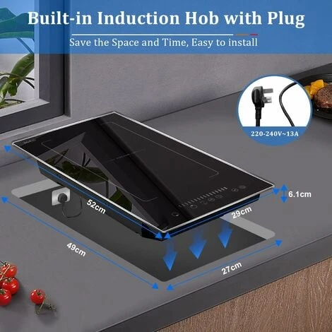 - 【Plug in Induction Hob】The 2 zone electric hob can be plugged into a standard 13 amp socket directly, no hardwired connection. The built-in electric hob 30cm is ideal for small kitchens, apartment, RV and student dormitory, or as an extra cooking utensil in your kitchen. Product Size: 52*29*6.1cm (L*W*H); Built-in Size: 49*27 cm.(L*W)