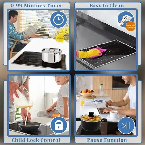 - 【Multi-function Electric Hob】The 2 zone induction hob will shutdown automatically when an excessive internal temperature is monitored. The child security lock can avoid accidental touching. ”H” Residual heat indicator will remind you don’t touch the hob. The hob is great for families with children and the elderly.