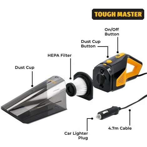 Is the inside of your car littered with food crumbs, pet hair, and other debris? Time to clean it away with TOUGH MASTER®’s corded car vacuum. This powerful 6000 PA handheld vacuum cleaner has a high-performance 90W motor for an extremely strong suction in a compact design, making for a dirt-free car interior. It is also easy to store in the car boot, so you can get it out whenever you feel is convenient. The car vac comes with 5 attachments for versatile use: a long tube for hard-to-reach areas, a brush for carpets and upholstery, a cleaning suction nozzle to clean under the car seats and other crevices, and two connectors. With different options, you’ll be able to use the hand held portable vacuum cleaner at full capacity. There is even a removable HEPA filter for high efficiency, which is also washable. This vacuum cleaner for home and car cleaning has a 4.7 metre cord, long enough so that you can clean the back seats comfortably, without having to pull on the wire. Not only this, but your neighbours will be happy, as this powerful hand hoover has a very low noise level at 70db, so there’ll be no disturbance.