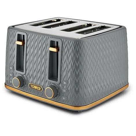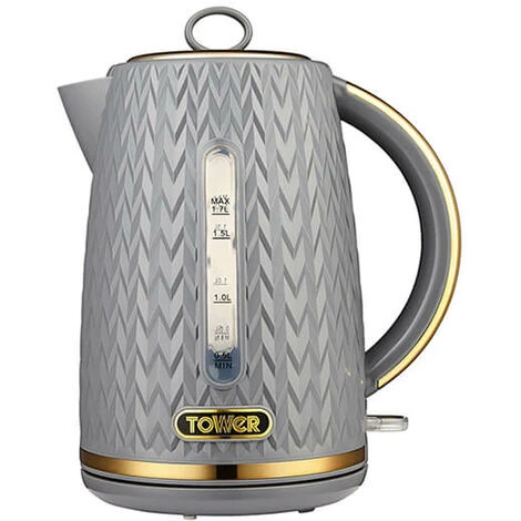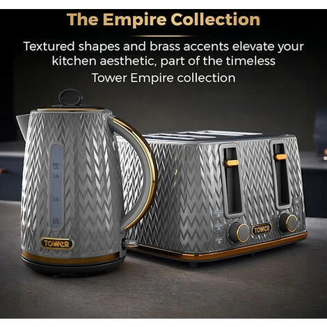 The Tower Empire 1.7 Litre Kettle and 4 Slice Toaster Set features a grey geometric design with brass accents will add a touch of style to your kitchen.