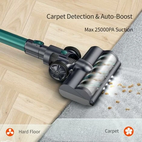 | 3 levels of Suction Power AdjustableModes switching sequence: Auto → ECO → Max. The vacuum cleaner will automatically adjust the suction power according to the ground type in Auto mode. The vacuum cleaner can last for 55 mins in ECO mode. The suction power of the vacuum cleaner will reach up to 25000Pa in Max mode. | Rotatable Brush Head & LED HeadlightsThe floor brush head can be rotated for multiple angels (can be bent at 180° and 90°) which is perfect for avoiding barriers under furniture to clean hard-to-reach spots.LED floor lights can illuminate every dark corner and help track any dust or pet hair. |